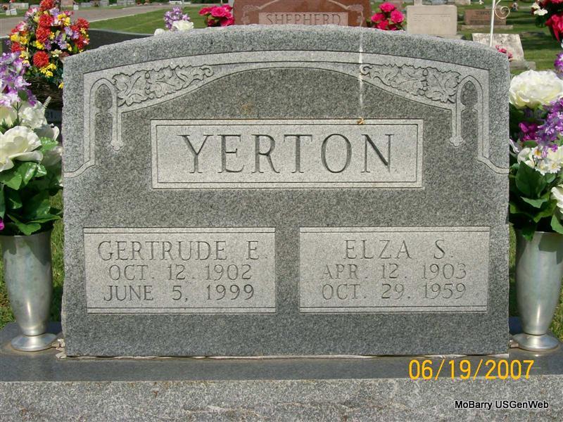 Research Note: Elza married Gertrude Elizabeth "Lizzy" Johnson on May 5, 1923 - Monett, MO. He was a retired RR employee. His wife was Elizabeth Johnson and she was the informant on the death certificate. Son of George Yerton and Artie Robinson. He had lived in Monett for 50 years. | Headstone Mary Homesley Death Certificate Phyllis Long Photo Jay Trace |