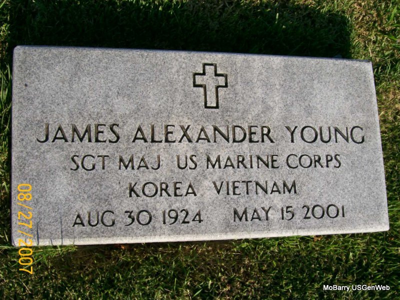 Inscription: "SGT MAJ US MARINE CORPS KOREA VIETNAM" - Research Note: United States Marine Corps - 76 years. James A. Young, age 76, of Iwakuni, Japan, died May 14 following a sudden illness. He was born August 30, 1924, in Arma, Kansas, and was a son of John L. and Jane (Finlay) Young. He was a graduate of Pittsburg, Kansas, junior and senior high schools and attended Kansas State Teacher's College. He was a Marine Corps veteran of the Korean and Vietnam conflicts. He was married to Chieko Young. | Monett Times Sept. 5, 2001 Mary Homesley Obit Donna Cooper Photo Jay Trace |