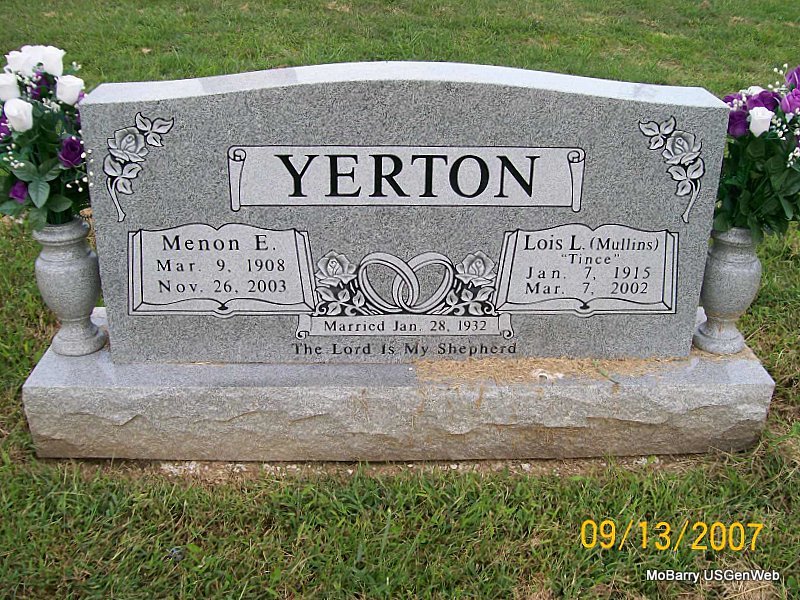 SSW: Lois L. Mullins - Inscription: "Jan. 28, 1932" - Research Note: Menon E. Yerton, age 95, of Monett, died November 26, 2003 at Monett Health Care Center. He was born March 9, 1908, in Monett, and was a son of Harrison Greeley and Clara Sarah Renda (Brown) Yerton. He was a retired railroad mechanic. He married Lois Lorene Mullins on January 28, 1932, in Neosho, and she preceded him in death March 7, 2002. - Menon Yerton first married Gladys Robertson on Aug. 6, 1927 in Barry Co., MO, divorced. | Nov. 28, 2003, Monett Times Donna Cooper MO Marriage Records Phyllis Long Photo Jay Trace |