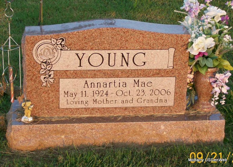 Inscription: "Loving Mother and Grandma" - Research Note: The following abstract gives some details about Annartia Mae (Yerton) Young, who died at the age 82. She passed away at the Park Place Care Center in Raytown, MO, on Oct. 23, 2006. Annartia was born May 11, 1924, in Monett, MO and in 1943, she married her first husband, SSGT John J. Donnini, of Wilkes Barre, PA. They shared successful ownership of Italian restaurants in both Monett and Rockaway Beach, MO, in the 1950's and '60's and then they divorced in 1966. He preceded her in death in 1976. She married second Joe T. "Smokey" Young, in 1968 and moved to San Bernardino, CA. He retired from the Santa Fe Railroad after 35 years of service, and preceded her in death in 1988. After residing in San Bernardino for 25 years, Amy returned to Raytown, MO in 1992 to be with her children. | Monett Times, Oct. 24, 2006 Donna Cooper Photo Jay Trace |