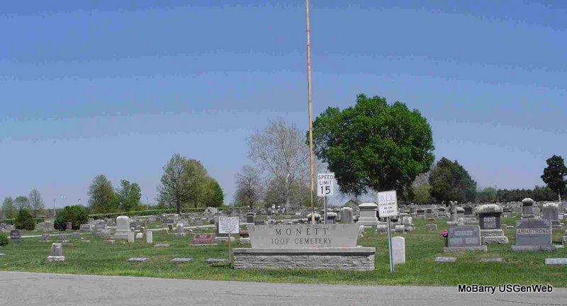 Some people think the IOOF Cemetery is in Barry County but it is actually in Lawrence County. The county line splits Monett at Cleveland Street which runs east and west. South of Cleveland Street is Barry Co. and North of Cleveland is Lawrence County. The cemetery is located North of Cleveland Street in Monett on Hwy 37, beside the KRMO radio station.