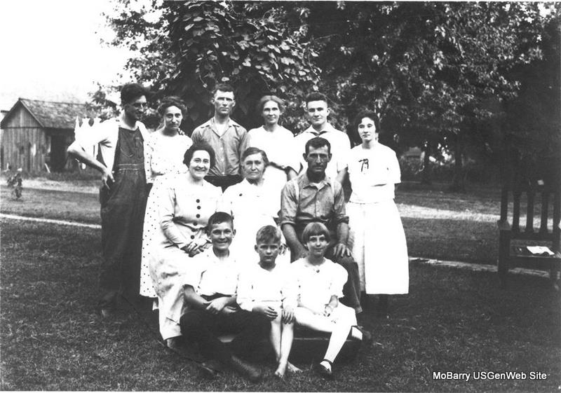 Taken 1919 in Monett. Back row: Preston and Geneva (Parsons) Brown, Jesse and Hazel Dell (Hink) Parsons, Harold and Hazel (Parsons) Spain. Middle row: Alice (Parsons) Reese, Amy (Meeker) Parsons, Eugene Parsons. Front row: James Parsons, Evelyn Parsons, Jesse Parsons, Jr. - Geneva, Jesse, Hazel, Alice and Eugene are Amy's children. James, Evelyn and Jesse, Jr. are Jesse and Hazel Dell's children and that family was visiting from Colorado. Everyone else lived in Monett. Submitted in 2008 by Bob Parsons |