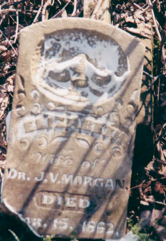 | MORGAN, Elizabeth (DOTY) | Abt. 1842 | Mar. 15, 1862 | Inscription: "Wife of Dr. J. V." - "Age 20Y, 1M, 21D" - Research Note: Died at age 37. Dr. J. V. Morgan AKA Joshua Gabriel Morgan, 1838-1911, buried in Hickman Cemetery under another alias, J. J. Morgan, next to his 5th and last wife Sarah Henson. Married Elizabeth Doty, his first wife, in 1859, she died 1862. | Note Phyllis Long Headstone Brandon Burns Photo Darla Marbut |