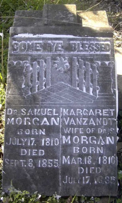 SSW: Margaret VanZandt - Research Note: Son of Gabriel Morgan and Mary McNabb. Dr. Samuel Morgan and his wife Margaret (Vanzandt) Morgan were early settlers of the Barry Co. area. At one time there was a post office near here and the town was called Mayflower, Missouri. That is long gone now, and only a few houses scattered here and there mark the once prospering area. Samuel and Margaret had the following children: Mary, Vesta, Dr. Joshua Gabriel, Zachariah Taylor, Martha, and Margaret. - 1850 Census, District 5, Barry, Missouri - Samuel Morgan, age 39; Margaret, age 40; Vashti, age 17; Joshua, age 14; Zachariah, age 2. | Note Census Phyllis Long Headstone Brandon Burns Photo Darla Marbut |