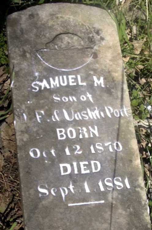 Inscription: "Son of W. F. and Vashti" - Research Note: Son of Warner Francis Potts and Vashti W. Morgan. Grandson of Samuel Joshua Morgan and Margaret Vanzandt. - 1880 Ash Twp., Barry Co., MO - District 2 - Warner F. Potts, age 44, born IL, farmer, parents born TN; Vashti Potts, wife, age 44, born TN, Keeping House, parents born TN; William Potts, son, age 21, born MO, farmer; Margaret Potts, daughter, age 19, born MO; Rebecca Potts, daughter, age 18, born MO; Mary Potts, daughter, age 15, born MO; Thomas J. Potts, son, age 14, born MO; Samuel Potts, son, age 10, MO; Gabriel Potts, son, age 5, MO; John P. Hall, age 18, born MO, farm laborer, father born IN, mother MO; Joseph Richards, age 21, MO, farm laborer, parents born KY. | Census Phyllis Long Headstone Brandon Burns Photo Darla Marbut |
