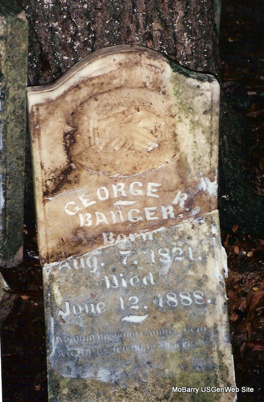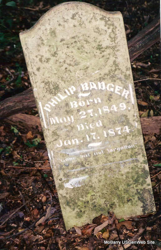 Research Note: Research Note: Researchers say he was the son of Daniel Badger and Hannah Malott. George first married Margaret Meyers and second married her sister, Barbary (Meyers) Oakley on Nov. 23, 1879. Barbary is buried at Washburn Prairie Cemetery next to her first husband William Oakley, died 1902. Margaret and Barbary were sisters and daughters of Phillip and Margaret Meyers. - 1870 Capps Creek Twp., Barry Co., MO - Geo. R. Badger, farmer, age 49, IN, white, male; Margaret, age 55, PA, white, female; Daniel, age 22, IN, white, male; Phillip, age 19, IN, white, male; Margaret, age 17, IN, white, female; Hannah, age 16, IN, white, female; Mary C., age 14, IN, white, female; Ebenezer, age 12, white, male; George, age 9, white, male. - Another Photo | Photos John Dill Mike Bivin Census Phyllis Long |