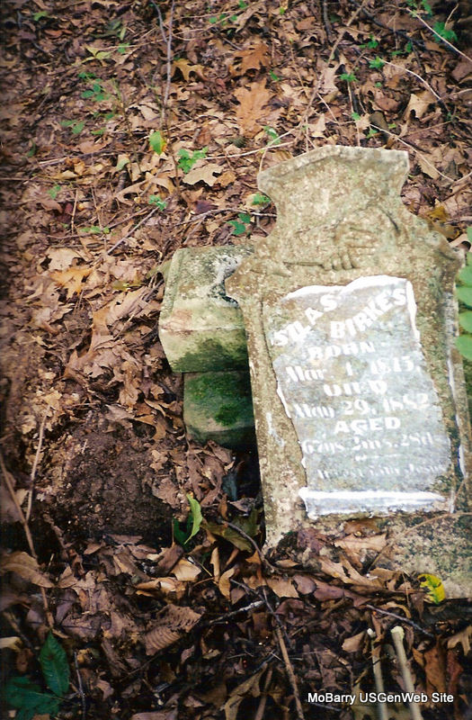 Inscription: "67 yrs. 2 ms. 28 dys." - Research Note: Researchers say he was the son of Charles Birkes and Mary Rogers. He married Sally Rogers on Dec. 16, 1835 in Hancock Co., IL, and Sally died Mar. 18, 1857 in Madison Co., AR, and then he married Elizabeth Coats in Seligman, MO, on Jan. 15, 1861. | Photo John Dill Mike Bivin IL Marriage Records MO Marriage Records Donna Cooper |
