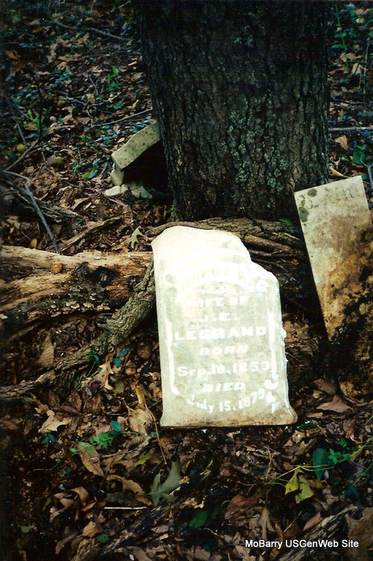 | LEGRAND, Nancy Ann | Sept. 18, 1853 | July 15, 1879 | Inscription: "Wife of J. E." - Research Note: Daughter of Daniel Brown and Elizabeth Ramah King. Nancy A. Brown married James E. Legrand on Aug. 11, 1870 in Lawrence Co., MO. Some say James died in 1892 in Newton Co. and is buried at Berwick Cemetery Berwick Newton Co., MO. There is a photo of his stone there with no dates. - Then, there is this news item - September 8, 1917, Saturday, Cassville Democrat - James E. LeGrand is dead at age of 71 years, 5 months and 13 days. His home was in Pierce City. - Pierce City is in Lawrence Co., MO. | Photo John Dill Mike Bivin MO Marriage Records Census Phyllis Long |