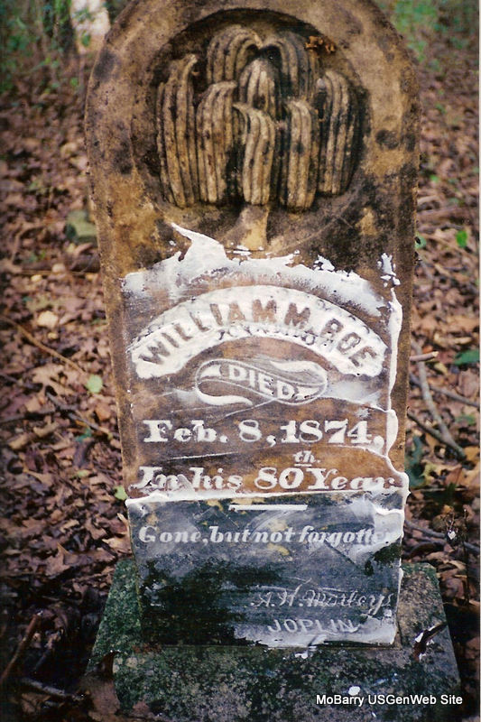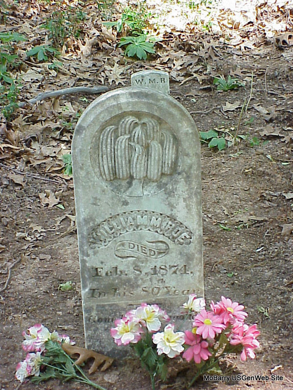 Feb. 8, 1874 | Inscription: "In his 80th yr. - Gone but not forgotten" - Research Note: Age 80 - William Matthew Roe was born in VA. His son Andrew W. Roe is buried in Mt. Olive Cemetery. William married Margaret Bell. - Todd Co., KY Family History - William M. Roe was born about 1795 in VA, son of Moses and Rebekah (Mantalowe) Roe. With his parents, he moved to Robertson Co., TN (Springfield). In about 1820, he married, in Robertson Co., to Margaret Bell, born about 1794 in TN, died Aug. 1856 in Todd Co., KY. She was the daughter of James and Mary (McMillan) Carmack Bell, and was an Indian of the Cherokee tribe. - Notes of Gertrude Bivin Myers, Toledo, OH - "This is on my mothers side" Grandmother Wolf (Mary M. Roe) said "The farthest back she ever heard was that her Grandfather (Moses Roe, father of William M.) was stolen from Ireland when he was thirteen years old and brought to this country (USA). After he was grown and married and had two sons, the Indians killed one and the other was Grandmothers father". - Another Photo - Footstone | Photos John Dill Mike Bivin Note Donna Cooper Notes Phyllis Long |