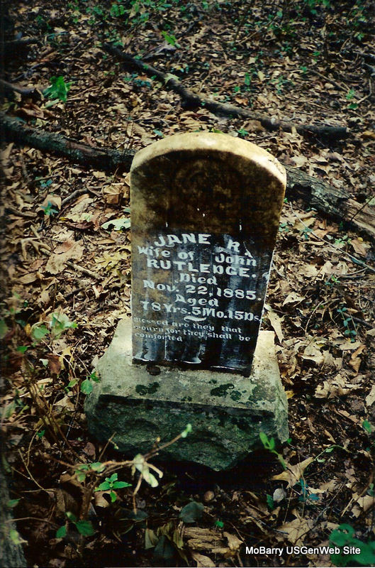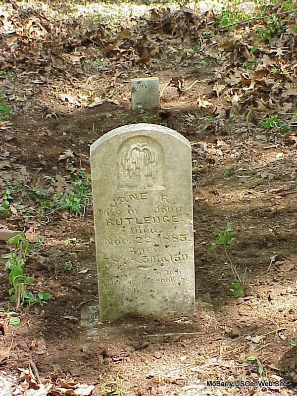 Inscription: "Age 78 yr, 5 mo., 15 dys" - Research Note: Jane was a daughter of Thomas and Nancy (Hood) Gaw. - Excerpt from a letter written from Billie Thomas Smith to his sister-in-law Jane (Gaw) (Brown) Rutledge Aug. 4, 1878 states "my children has all married but two, Nancy Jane and James Munrow is at home yet. Tildy Gaw is as well as... Tell me about Daniel Brown, if he is living or where he is. ...my daughter Sinthadns man [sic] has went to the MC or MO Iron Co. She will start to move out there in a few dayes." - Tildy Gaw is Billie's sister-in-law Matilda (Rutledge) Gaw, Wiley Gaw's widow, and sister to Jane's 2nd husband John Rutledge. Daniel Brown born Oct. 6, 1825 is Jane's son by her first husband, Daniel Brown who died bef 1834. Family tale is Daniel was involved in a feud and when John Rutledge proposed to Jane, she said she'd marry him if he took her away from Tennessee. They moved to Missouri. - Another Photo - Another Photo | Photo Jack Fly Photos John Dill Mike Bivin Note Donna Cooper Notes Phyllis Long |