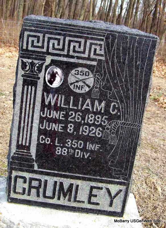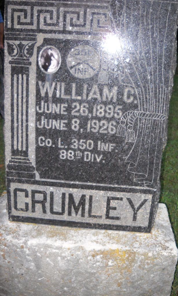 Inscription: "Co. L. 350 Inf. 88th Div." - Research Note: William Crumley was a son of John Elwood and his wife Susan B. Cox. His death certificate reads that his parents were John E. and Susan (Cox) Crumley, both born in GA. He was divorced and a barber. He died from the effects of TB, which he contracted during the war. His father was the informant on the death certificate. Listed in census records as Clayton. Some say his middle name was Coats. The death certificate for his son, Samuel Ervin Crumley, gives father, John C. Crumley and mother Emily Lee. May have also been married to Opal Wallace. - Photo on Stone - Another Photo - Photo On Stone - Photo On Stone - Photo of William | Death Certificate Note Donna Cooper Census Phyllis Long Photos Darla Marbut Photos Ted Roller Donna Cooper |
