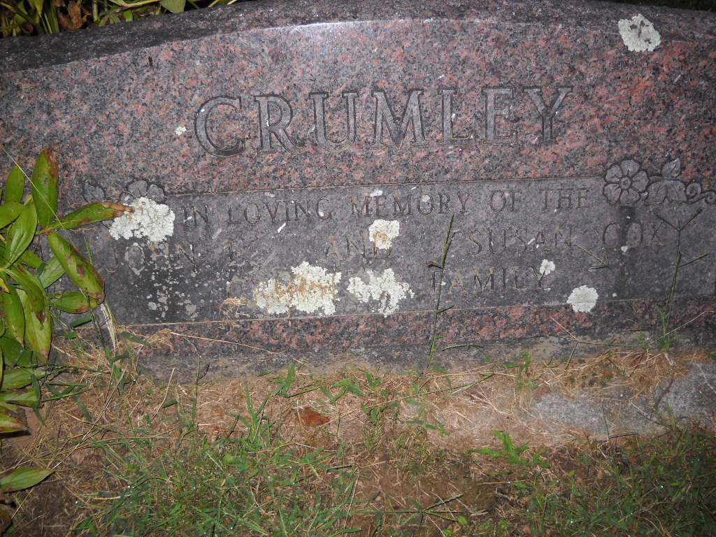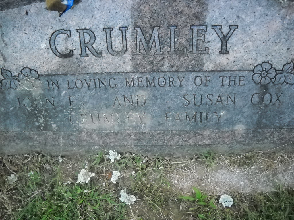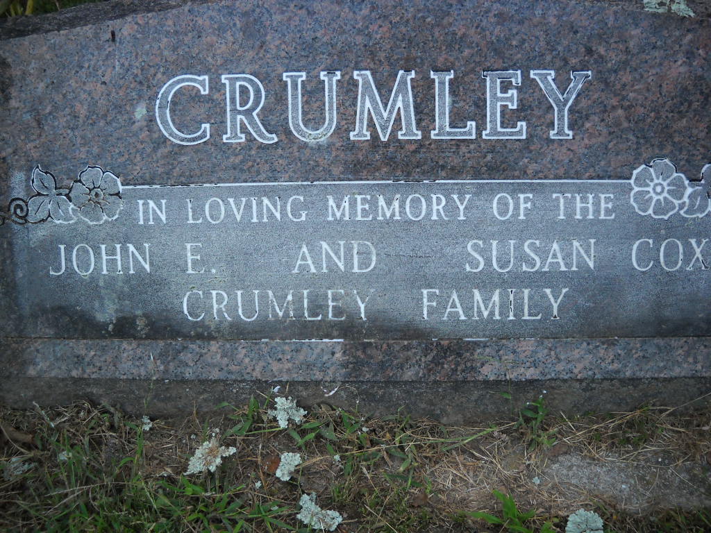Inscription: "In Loving Memory of the Crumley Family - John E. and Susan Cox Crumley Family" - Research Note: John Elwood Crumley was married to Susan Cox. Elwood Crumley of Fairview, MO was the informant on the death certificate. - Daughter of William Anderson Cox and Mary (Crumley) (Cox) Hart. John E. Crumley married Susan C. Cox on Oct. 18, 1881 in Barry Co., MO. - Another Photo | Note Donna Cooper Death Certificate MO Marriage Records Phyllis Long Photo Darla Marbut Photo Ted Roller Donna Cooper |