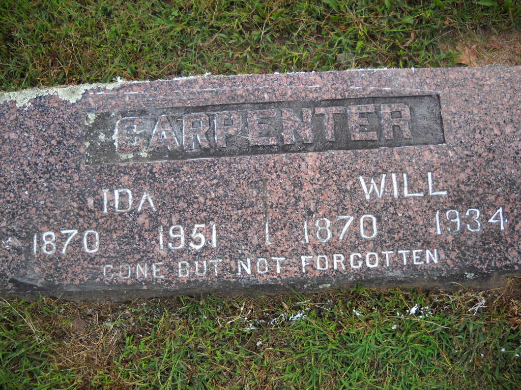 SSW: Ida E. - Inscription: "Gone But Not Forgotten" - Research Note: His death certificate reads that George W. Carpenter and Hettie (Pulley) Carpenter were his parents. George was born in Cooper County, MO, and Hettie in Patton? Co., MO. He was married and Ida E. Carpenter was his wife's name. He was a miller - manager. The cause of death was heart attack. Mrs. Ida E. Carpenter, Fairview, MO, was the informant. | Death Certificate Donna Cooper Photo Ted Roller Donna Cooper |
