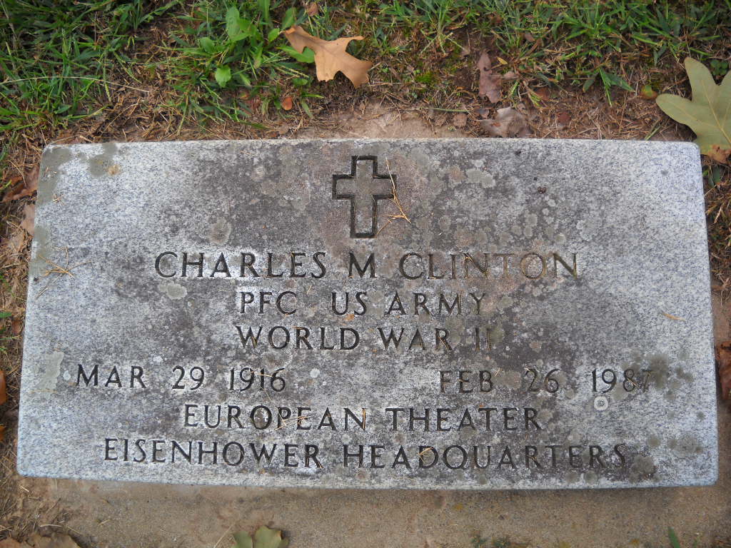 | CLINTON, Charles M. | Mar. 29, 1916 | Feb. 26, 1987 | SSW: Catalina "Pat" - Inscription: "Married Jan. 8, 1947" - Research Note: Son of Silas Clinton and Laura Ann Pierce. - Military Stone - Inscription: "PFC US ARMY WORLD WAR II - EUROPEAN THEATER - EISENHOWER HEADQUARTERS" | Census Phyllis Long Photos Ted Roller Donna Cooper |