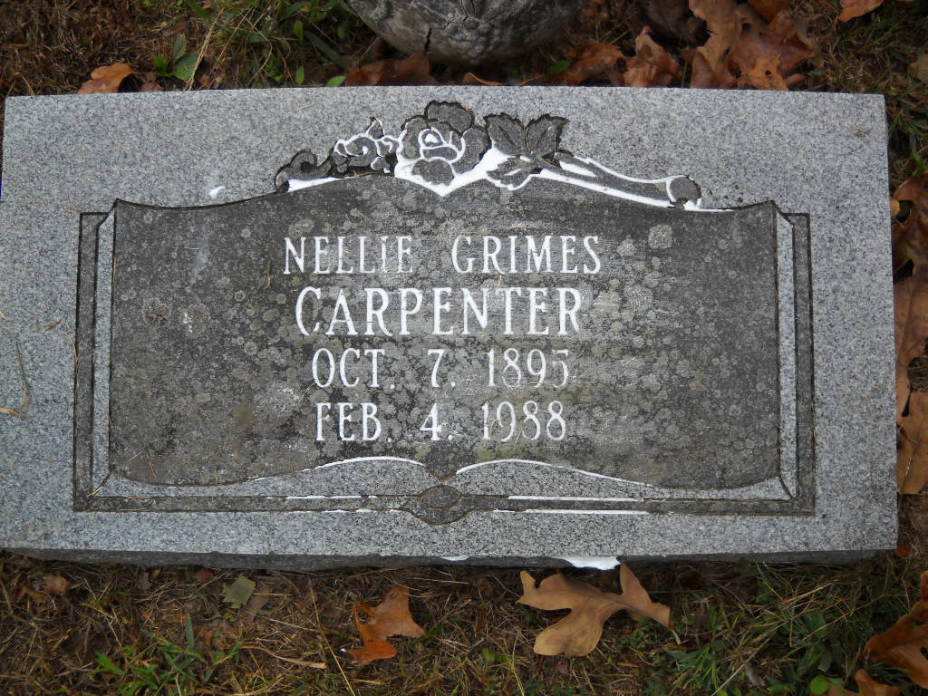 | CARPENTER, Nellie Cecilia (GRIMES) | Oct. 7, 1895 | Feb. 4, 1988 | Research Note: On Sarah Luzettie (McAllister) Grimes, her mother's death certificate, she is listed as the informant. William Grimes was her father's name. Second wife of Samuel Thomas Carpenter. Nellie C. Grimes married Samuel T. Carpenter on July 5, 1917 in Newton Co., MO. | Note Donna Cooper MO Marriage Records Phyllis Long Photo Ted Roller Donna Cooper |