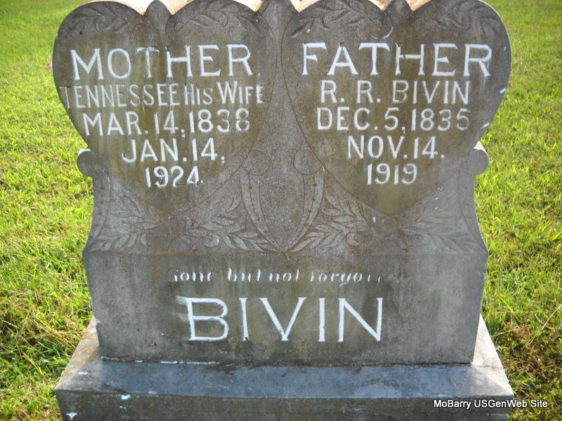 | BIVEN, Richard Riley | Dec. 5, 1835 | Nov. 14, 1919 | SSW: Tennessee - Research Note: Richard Riley Biven married Julia Ann "Tennessee" Roe in Sept. 1858 in Todd Co., KY. - 1880 Census, Capps Creek Twp., Barry Co., Missouri - Richard Bivin, Self, Married, Male, White, 44, KY, Farmer, KY, KY; Julia A. Bivin, Wife, Married, Female, White, 41, KY, Keeping House, VA, TN; William Bivin, Son, S, Male, White, 18, KY, At Home, KY, KY; Henry Bivin, Son, S, Male, White, 16, KY, At Home, KY, KY; Alice Bivin, Dau, S, Female, White, 12, KY, KY, KY; Martha Bivin, Dau, S, Female, White, 10, KY, KY, KY; Tennessee Bivin, Dau, S, Female, White, 7, MO, KY, KY - 1910 Census, Shoal Creek, Barry, Missouri - Richard R. Biven, head, age 74, married once, born KY; Julia, wife, age 72, married once, mother of 8 children, 5 living, born KY; Richard R., grandson, age 16, born KS. - October 13, 1917, Saturday, Cassville Democrat - Pioneer: Willie, Tennie and Bertha Bivens of Wentworth, spent last week here called by the serious illness of their Grandfather, Richard Bivens. He is thought to be a little better at this writing. - December 8, 1917, Saturday, Cassville Democrat - Grandpa Bivens has recovered from a protracted illness, enough to be moved to his daughter's. Mrs. Tom West, 3 miles north of town. | KY Marriage Records Census Online Newspapers Phyllis Long Photo Ted Roller Donna Cooper |