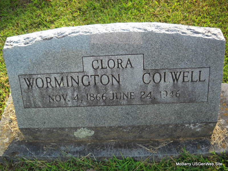 Research Note: Wife of William P. Colwell. Daughter of Harrison Gaw and Mahalia Prewitt. Harve Wormington of Fairview, MO was the informant on the death certificate. - William Richard Wormington married Clora Gaw on July 29, 1887 in Mt. Vernon, Lawrence Co., MO. | Death Certificate Phyllis Long Photos Ted Roller Donna Cooper |