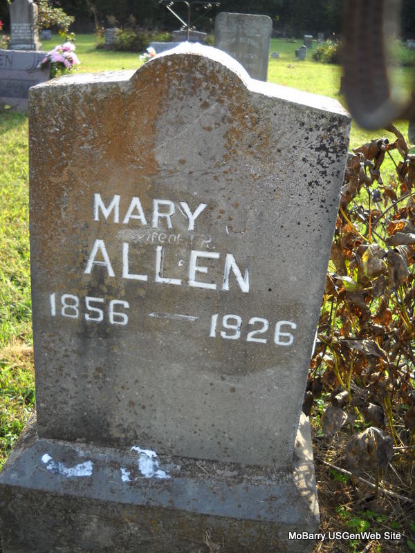 Research Note: Wife of John R. Allen. Daughter of John B. Hutchens born OH and Elizabeth Tulbert born NC. E. W. Love was the informant on the death certificate. Mary J. Hutchens married John R. Allen on Oct. 21, 1881 in Barry Co., MO. - Photo of John and Mary Jane with the Hutchens family | Death Certificate MO Marriage Records Phyllis Long Photo Ted Roller Donna Cooper |