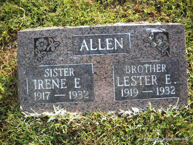 SSW: Sister Irene E. - Research Note: Wheaton Journal - Thursday, March 17, 1932 - Pioneer News - Lester Allen, son of Mr. and Mrs. Ed Allen, died at the Stella Hospital Thursday afternoon at four o'clock. Services were held at Mt. Olive Church Saturday afternoon at two o'clock conducted by Rev. Chas. McNabb of Wheaton. Burial was made in the Mt. Olive Cemetery under the direction of Belka's Funeral Parlor. Phyllis' Note: He was a son of Edgar P. Allen, born MO and Dolly McMillen, born MO. His death certificate is on file in McDonald County and lists meningitis caused by influenza as the cause of death. Stella Hospital is in Newton Co., MO, so the obit must be mistaken about where he died since the death certificate has that he died in McDonald County. Stella is given and then marked out on the death certificate. | Online Obit Note Donna Cooper Online Obit Death Certificate Phyllis Long Photo Ted Roller Donna Cooper |