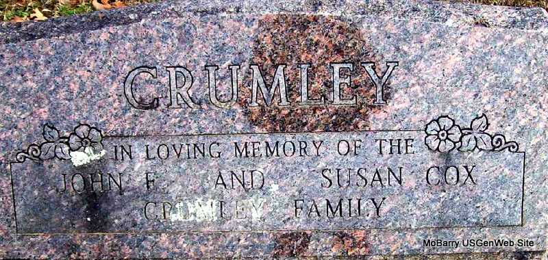 Inscription: "In Loving Memory of the Crumley Family - John E. and Susan Cox Crumley Family" - Research Note: John Elwood Crumley was a son of William Erwin and Margaret (Wetzel) Crumley. It was William Erwin Crumley who murdered his uncle in Georgia. John's father, William Erwin Crumley, shot and killed his uncle John Crumley sometime in 1857 in Gordon Co., GA. In Jan 1858, the government of Georgia posted a $100 reward for the return or capture of the fugitive, William Erwin Crumley. Fannin Co., Georgia newspaper, "In Fannin County, recently, John Crumbly was murdered by William Erwin Crumbly." January 18, 1858. The Governor of GA put up a $100 reward in January of 1858 for the return of the fugitive, William Ervin Crumley. Thomas and family moved to Barry Co., MO around 1857 or 1858 and probably the move was to get William out of state and to avoid prosecution. William's wife, Margaret Witzel Crumley, stayed in GA with her parents and moved to Barry Co., MO sometime after 1880. She is listed on the 1900 census living two doors away from her son, John E. and his family. His death certificate has his death date as Mar. 29, 1936, Newton Co., MO, and born Apr. 26, 1856 Fannin Co., GA, and lists his father as Erwin Crumley and his mother with a maiden name of Taylor. Erwin Crumley, Stark City, MO, was the informant. - Civil War Record: Military: Age 23. Enrolled Co. L, 76th EMM 2/11/1863 at Cassville (31 days). Enrolled Co. G, 7th PEMM 4/1/1863 at Mt. Vernon (474 days). Enlisted Co. D, 46th MO Infantry 9/4/1864 at Mt. Vernon. - Another Photo - Photo of John Elwood | Death Certificate Note Donna Cooper Online Obit Photo Darla Marbut Photo Ted Roller Donna Cooper |