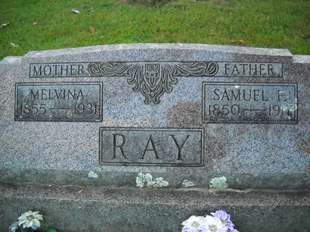 SSW: Melvina - Inscription: "Father" - Research Note: Son of Samuel C. Ray and Caroline Elizabeth Foster. He married Melvina Birkes July 4, 1872 in Barry Co., MO. - The Neosho Times, Neosho, Newton County Missouri, December 20, 1917 - Mr. Samuel F. Ray died at his home four miles north of Fairview, Mo. Dec. 6, 1917, with pneumonia. He was born May 8, 1850, age 67 years and 7 months. The funeral service was conducted by Eld. L. Carlin at the Mt. Olive Baptist church at 11 o'clock. Dec. 7, 1917, and the remains were laid to rest in the Mt. Olive cemetery. Mr. Ray was married to Miss Melvina Burkes, July 4, 1872. To this union was born ten children, two being dead. He left his wife and eight children, three sons and five daughters and a host of friends to mourn his departure. By the death of Mr. Ray his wife has lost a noble companion, his children a generous father, and the community a citizen who was one among the best neighbors whose hands and heart was always ready to bestow charity and comfort on the poor and distressed — A Friend. | Note Donna Cooper Census Obit Phyllis Long Photo Ted Roller Donna Cooper |