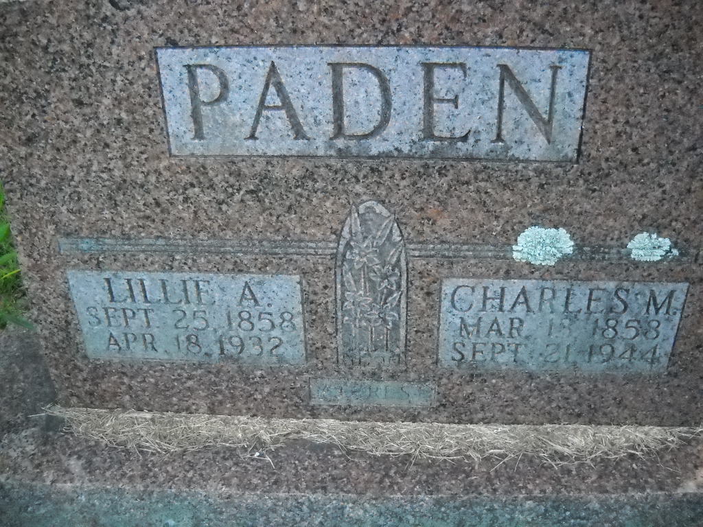 SSW: Charles M. - Research Note: In 1880 Lillie and Charles were living in Rountree, Montgomery Co., IL, and in 1930 they were in Newtonia, Newton Co., MO. Her death certificate reads that she died on Apr. 17, 1932 and not the 18th as the stone reads. Lillie McNeal married Charles M. Paden on Mar. 13, 1878 in St. Louis, MO. It lists her parents as Thomas McNeil, born Ireland and Judy Wilson, born Alton, IL, and that she was the wife of a farmer. Cerebral hemorrhage was given as the cause of death. Marie Taggart, Fairview, MO, was the informant. - Wheaton Journal, April 21, 1932 - Mrs. Charles Paden, 73 years old, died at her home four miles northeast of Fairview at seven o'clock Monday morning, April 18. Surviving are the husband, four sons, Elmo Paden of Stark City, Henry Paden of Eldorado, and a daughter, Mrs. Marie Taggard of Fairview. Funeral services were conducted at 2 o'clock Tuesday afternoon by Rev. Francis Goodnight and burial made in the Mount Olive Cemetery. | Note Death Certificate Donna Cooper Online Obit Phyllis Long Photo Ted Roller Donna Cooper |