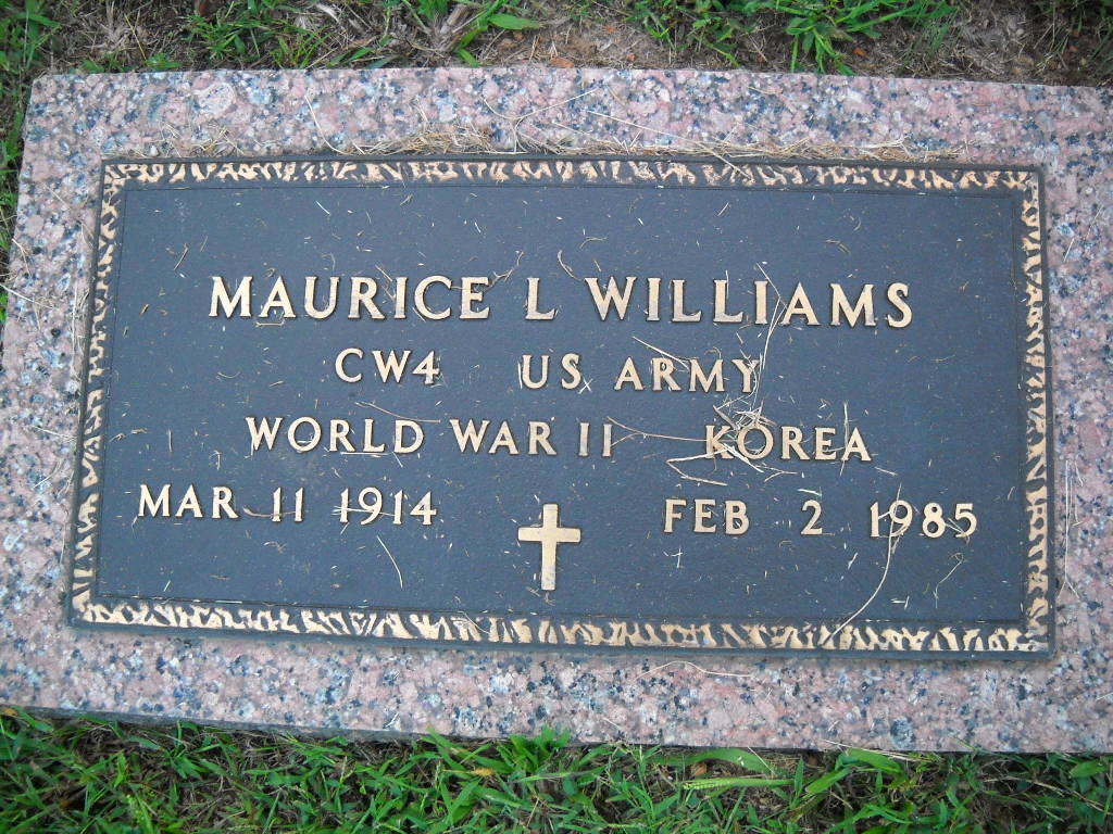 | WILLIAMS, Maurice L. | Mar. 11, 1914 | Feb. 2, 1985 | Inscription: "CW4 US ARMY - WORLD WAR II KOREA" - Research Note: Son of Walter L. Williams and Myrtle Stark. | Census Phyllis Long Photo Ted Roller Donna Cooper |