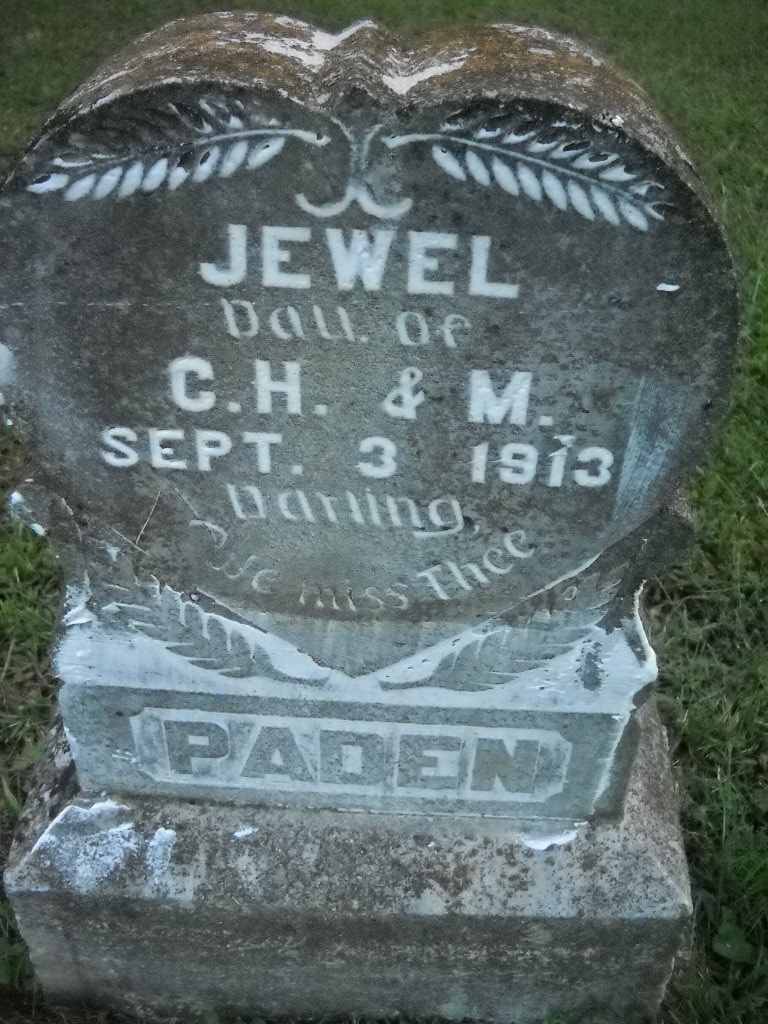 | PADEN, Jewel | No Date | Sept. 3, 1913 | Inscription: "Dau. of C. H. and M. - We Miss Thee" | Photo Ted Roller Donna Cooper |