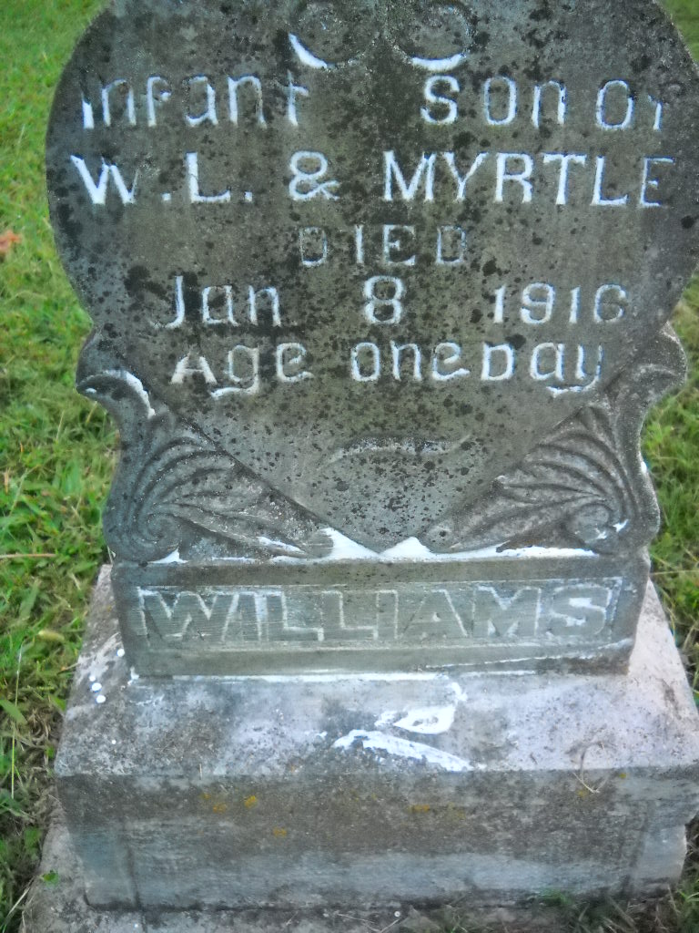 Inscription: "Infant Son of W. L. and Myrtle Williams - Age One Day" - Research Note: His death certificate reads that his father was Walter Williams, born MO, and Myrtle Stark, born MO. This child was born prematurely. He is listed as buried in IOOF Cemetery, which must be incorrect since he has a stone in Mt. Olive. | Death Certificate Donna Cooper Photo Ted Roller Donna Cooper |