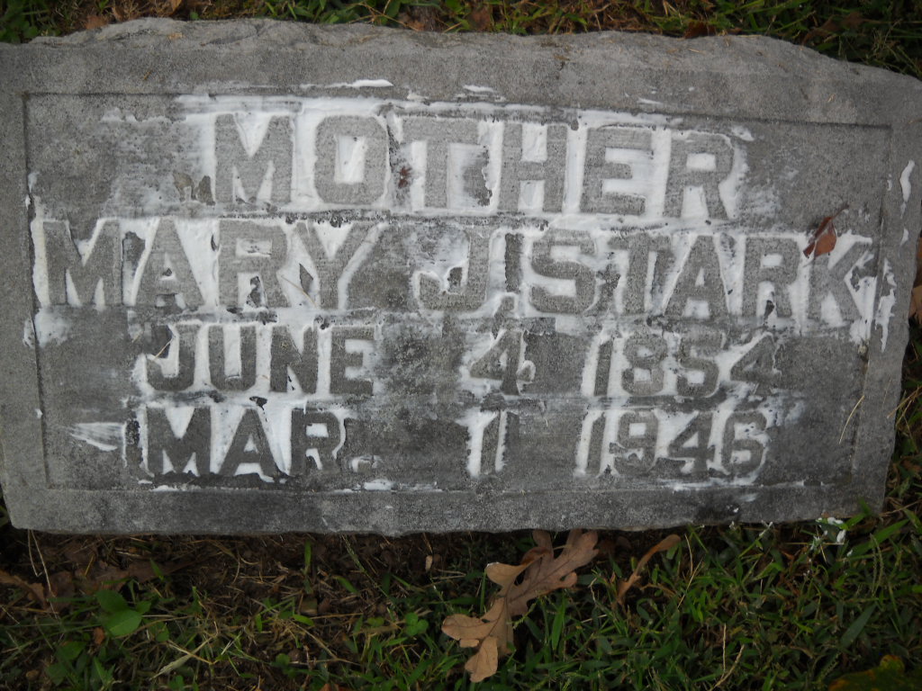 Inscription: "Mother" - Research Note: George Stark married Mary J. Halstead on May 18, 1879 in Lawrence Co., MO. Her death certificate reads that she was buried in Pierce City Cemetery, but since she has a stone here in Mt. Olive, she is probably buried here. Daughter of Charles H. Halstead and Elizabeth Yetman. George Stark was listed as her husband. Influzena was the cause of death. Rural Pioneer, MO, was her usual address. Mrs. John Reynolds of Stotts City, MO, was the informant on the death certificate. - Stark plot stone | Death Certificate Donna Cooper MO Marriage Records Phyllis Long Photos Ted Roller Donna Cooper |