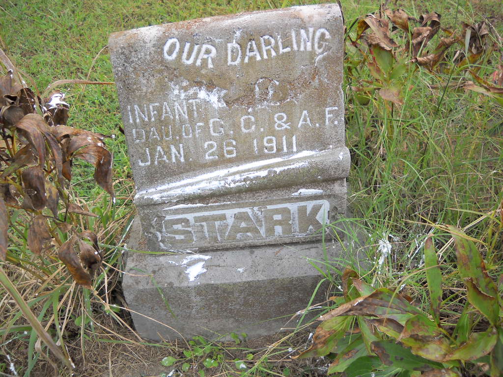 | STARK, Infant | No Date | Jan. 26, 1911 | Inscription: "Our Darling - Infant Dau. of G. C. and A. F." - Research Note: Daughter of Grover Cleveland Stark and Ada Frances McMillen. Grover was the son of George Washington Stark and Mary Halstead. Born Jan. 19, 1887 in Pierce City, Lawrence Co., MO and died Apr. 19, 1951 in Pampa, Gray Co., TX. Ada was the daughter of William F. McMillen and Nettie Fink. Born Oct. 10, 1888 MO and died June 19, 1981 in Pampa, Gray Co., TX. | TX Death Certificates Phyllis Long Photo Ted Roller Donna Cooper |