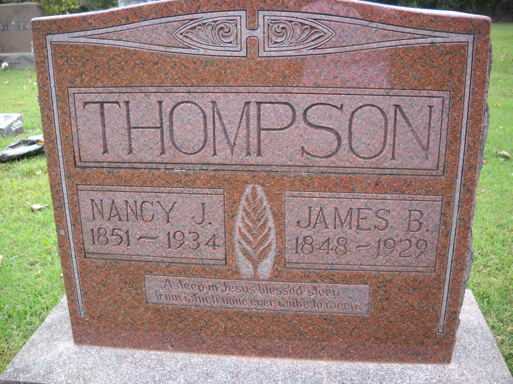 SSW: James B. - Research Note: There is very little information on her death certificate and her parents names aren't listed. Chronic Nephritis was the cause of death. Robert Thompson, Fairview, MO, was the informant. James B. Thompson married Miss N. J. Pulley on Nov. 9, 1873 in Newton Co., MO. Nancy's sister, Hettie Ann (Pulley) Carpenter, is buried at Mt. Olive Cemetery and her death certificate gives their parents as Robert Pulley and Mary Berry. - Researchers have that she was Nancy Jane Pulley, born in Pettis Co., MO. James and Nancy's children were Robert Andrew Thompson b: Aug. 27, 1874 in Fairview, Newton County; Mary Kathryn Thompson b: Aug. 23, 1880 in Newton County; Sarah Lee "Sallie" Thompson b: Feb. 1, 1884 in Newton County; Nancy B. Thompson b: May 1886 in Missouri; and Hettie A. Thompson b: Aug. 1888 in Missouri. Robert married Lena Maude Wormington, a daughter of W. R. and Nancy (Thomas) Wormington. | Note Death Certificate Donna Cooper MO Marriage Records Census Phyllis Long Photo Ted Roller Donna Cooper |