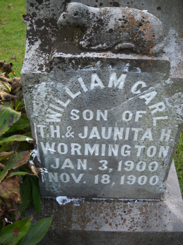 | WORMINGTON, William Carl | Jan. 3, 1900 | Nov. 18, 1900 | Inscription: "Son of T. H. and Juanita H." - Research Note: Son of Thomas Harvey Wormington and Juanita Harrison Stewart. - Another Photo | Note Phyllis Long Photo Darla Marbut Photo Ted Roller Donna Cooper |