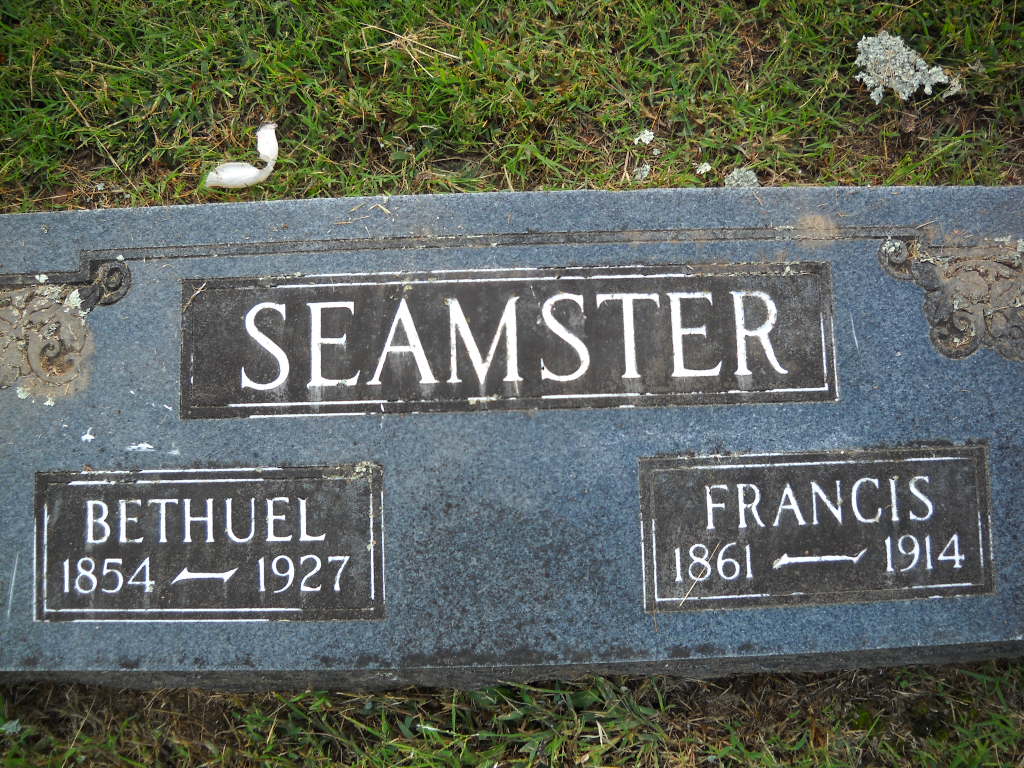 | SEAMSTER, Bethuel | Apr. 6, 1854 | 1927 | SSW: Francis - Research Note: He married Frances Paralee "Fanny" Williams, daughter of James Madison Williams and Artelia Elizabeth Barker, Aug. 8, 1880. Their daughter Cora married William Gum. Another daughter, Laura, married Leonard Hankins. Bethuel was a son of Williamson Shaw and his, first wife, Susannah Rite/Wright (Rigsby) Seamster. His father married second to Mary Ann Pendergraft and is said to have had 19 children by both wives. - September 8, 1917, Saturday, Cassville Democrat - Seamster Reunion: The eight sons, daughters and grandchildren met Friday, Saturday and Sunday at Rock Springs Church, south of Washburn, 3 1/2 miles, in memory of their father and mother, the late Rev. and Mrs. Wm. Seamster, who are buried in the cemetery at that place. Those of the children that were present were: Martin Seamster, Bentonville, and F. M. Seamster, Avoca, Ark.; Mrs. Amanda A. Campbell, Joplin; Bethuel Seamster and wife of near Fairview, Newton County; Mrs. Ellen Arwood, Joplin; Isaiah Seamster, Pea Ridge, Ark.; Mrs. Julia M. Hedrick, Kansas City; Mrs. Jemerson, Centerton, Ark.; and nine grandchildren. Elder F. M. Seamster held services at the church Sunday, which were very impressive. There were a number of people present, that were acquainted with the Seamster family. A very large crowd of people were present. They intend holding a meeting there again in two years. They thanked the people for their many courtesies extended them in their midst. | Note Donna Cooper Online Newspapers Phyllis Long Photo Ted Roller Donna Cooper |