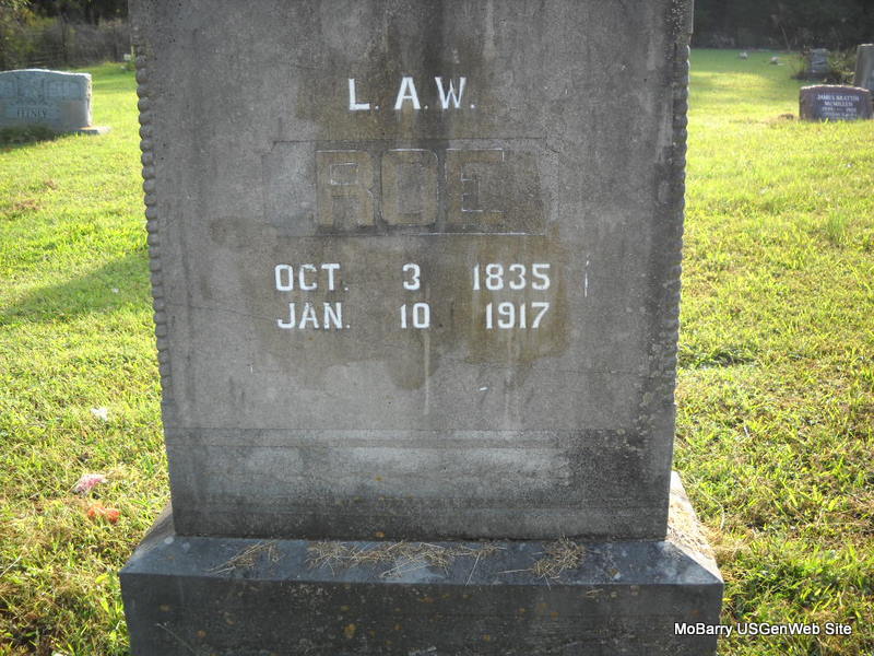 Research Note: Inscription: "L. A. W. Roe" - Death Certificate indexed as Andrew W. Roe. He was single, a farmer, and a son of William Roe, born VA. His mother was not named, born VA. E. C. Roe of Pierce City, MO, was the informant. Stone has birth year 1835. - Son of William Matthew Roe and Margaret Bell. | Death Certificate Census Phyllis Long Photo Ted Roller Donna Cooper |