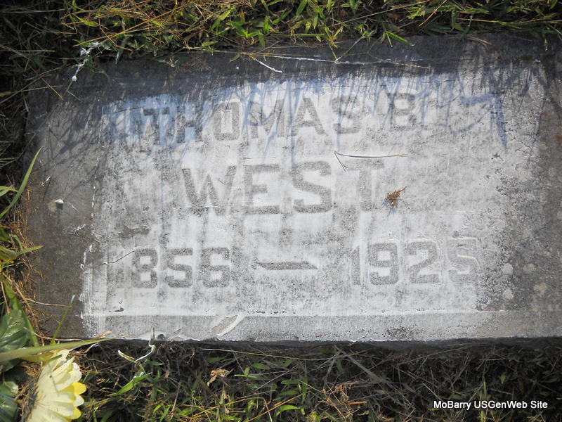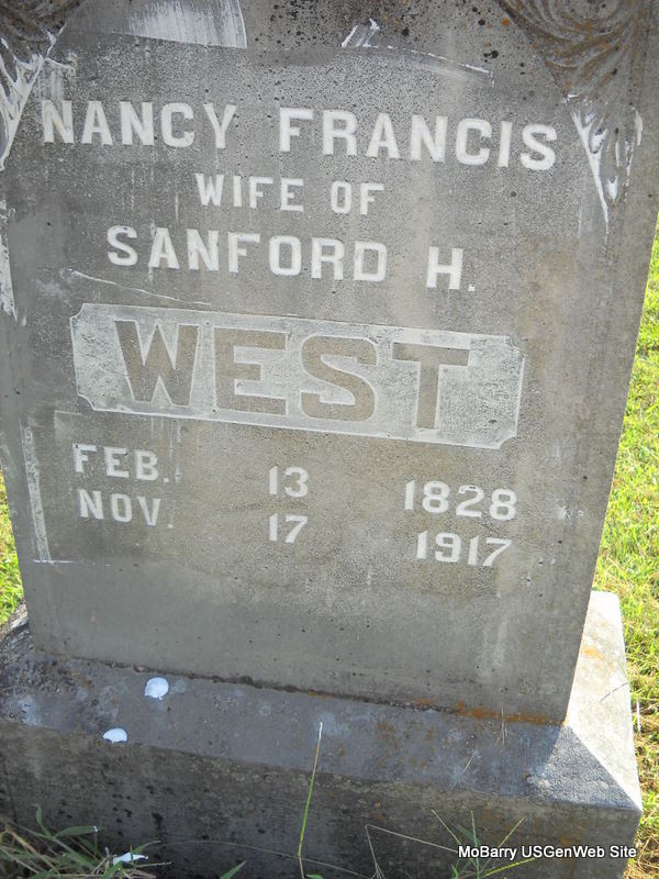 Inscription: "Wife of Sanford H. West" - Research Note: Father given as Boyd. No other information. T. R. West of Newtonia, MO was the informant on the death certificate. - Cassville Democrat, Nov. 24, 1917 - Grandma West was buried in the Mt. Olive Cemetery, Monday, age 89 years. | Death Certificate Online Obit Phyllis Long Photo Ted Roller Donna Cooper |