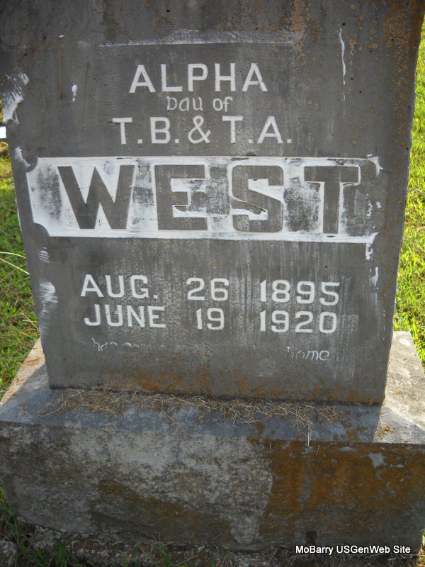 | WEST, Lizzy Alphazino "Alpha" | Aug. 26, 1895 Newton Co., MO |