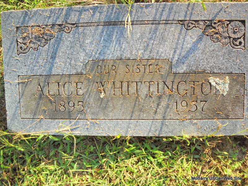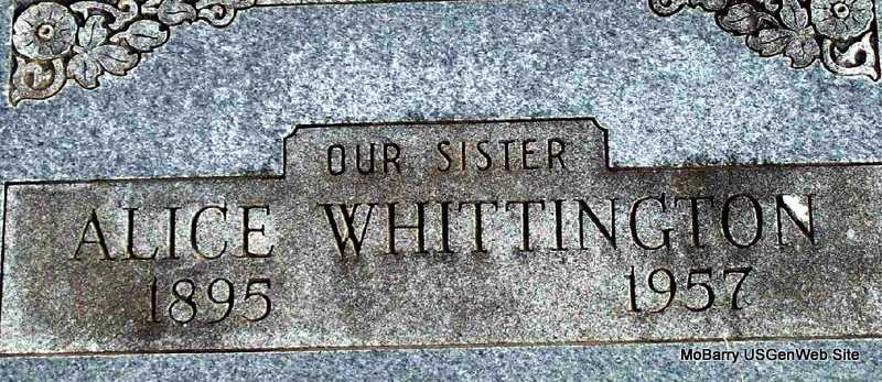 Inscription: "Our Sister" - Research Note: Daughter of Henry Clay Whittington and Martha Bivin. Mrs. Lola Stroud of Fairview, MO was the informant on the death certificate. - Another Photo | Death Certificate Phyllis Long Photo Darla Marbut Photo Ted Roller Donna Cooper |