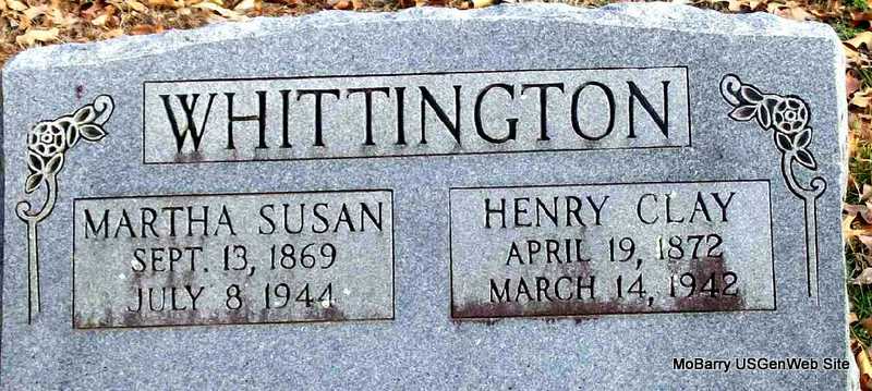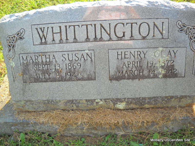 | WHITTINGTON, Henry Clay | Apr. 19, 1872 | Mar. 14, 1942 | SSW: Martha Susan - Inscription: "Married Mar. 5, 1899" - Research Note: Son of Henry C. Whittington and Mary J. Jerdin. Cassville Republican, Barry Co., MO, Thursday, Jan. 11, 1900 - Gunter News: Henry Whittington of Pioneer was visiting relatives on Gunter last week. - Cassville Republican, Barry Co., MO, Thursday, Feb. 8, 1900 - Eagle Rock News: Wednesday and Thursday. Uncle Henry Whittington of Pioneer was visiting friends and relatives at Eagle Rock and buying chickens, preparatory to starting up a henery. - Oct. 27, 1910, Thursday, Cassville Republican - Pioneer: Henry Whittington was visiting his daughter, Mrs. Hawk, at Newtonia. Mrs. Hawk's little boy has a bad case of fever. - Another Photo | Census Online Newspapers Phyllis Long Photo Darla Marbut Photo Ted Roller Donna Cooper |