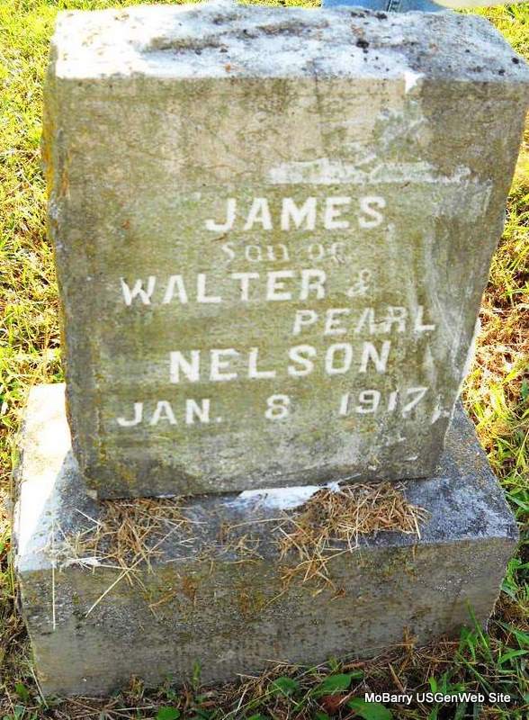 | NELSON, James | No Data | Jan. 8, 1917 | Inscription: "James - Son of Walter and Pearl Nelson" - Research Note: Cassville Democrat, February 24, 1917 - Mr. and Mrs. Walter Nelson of Fairview started with a sick child to be treated by Dr. Northcutt and on the way the child had convulsions and when they arrived here, the infant was beyond human aid and died at the hotel Saturday night. The parents returned home Sunday. | Online Obits Phyllis Long Photo Ted Roller Donna Cooper |