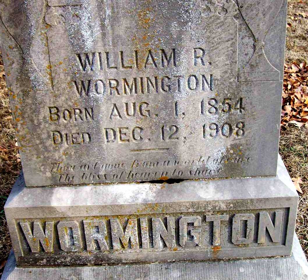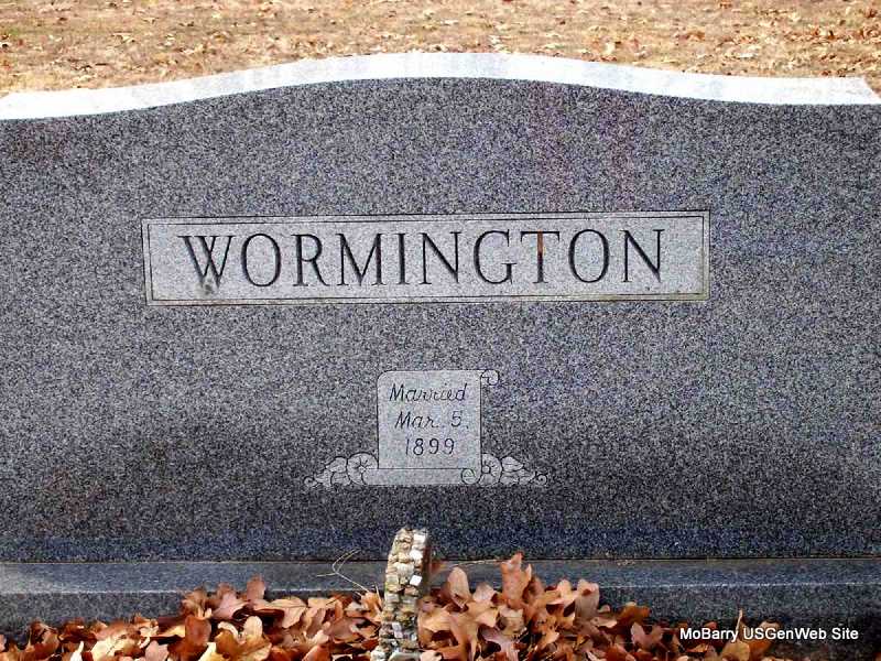 | WORMINGTON, William Richard | Aug. 1, 1854 | Dec. 12, 1908 | Research Note: Son of Jesse William Wormington and Elizabeth Emaline Boyd. William R. Wormington married Margaret E. Thomas on Oct. 10, 1875 in Jasper Co., MO. She died in 1877. William R. Wormington married Nancy P. Thomas on Sept. 18, 1879 in Jasper Co., MO. Nancy died in 1884. W. R. Wormington married Clora Gaw on July 29, 1887 in Mt. Vernon, Lawrence Co., MO. - February 20, 1904, Cassville Democrat - Pioneer News: W. R. Wormington has had a telephone placed in his home. | Census MO Marriage Records Online Newspapers Phyllis Long Photo Darla Marbut |