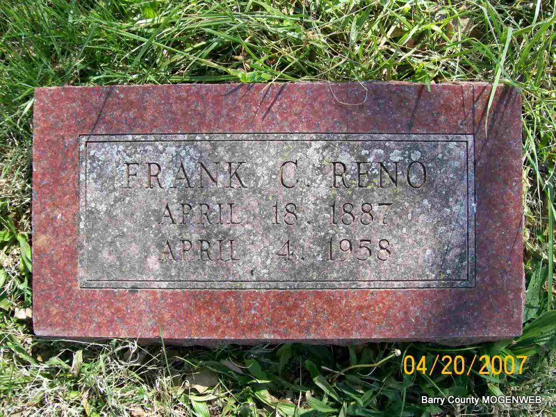 Research Note: He was a black smith. Son of Benjamin Reno and Mary Parks. His wife was Rose Reno and she was the informant on the death certificate. He was hit by a car when crossing an ally. Ova Rose Beck was the daughter of James A. and Martha Beck - February 8, 1912, Thursday, Cassville Republican - Mineral Springs News: Frank Reno and Joe England were at the bedside of their sister and sister-in-law, Mrs. England, last week, but have returned home. - March 28, 1912, Thursday, Cassville Republican - Frank Reno of Mineral Springs has moved to Purdy. - September 30, 1915, Thursday, Cassville Republican - Mineral Springs News: Frank Reno and mother and Miss Gladys England spent Sunday with John England and family. | Death Certificate Online Newspapers Census Phyllis Long 1999 Transcription Monett Times Obit Photo Jay Trace |