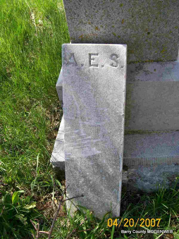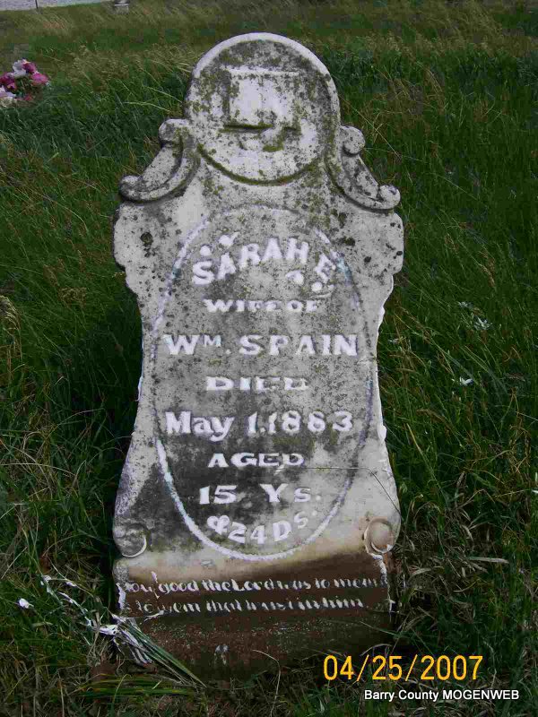 | SPAIN, Sarah Ellen (EDEN) | Apr. 7, 1868 | May 1, 1883 | Inscription: "Aged 15 yrs. 24 days - Wife of Wm." - Research Note: Daughter of Jonathan Eden and Melinda Jane (Stockton) Martindale. William W. Spain married Sarah E. Eden on Apr. 2, 1882 in Barry Co., MO. | MO Marriage Records Census Phyllis Long 1999 Transcription Photo Jay Trace |