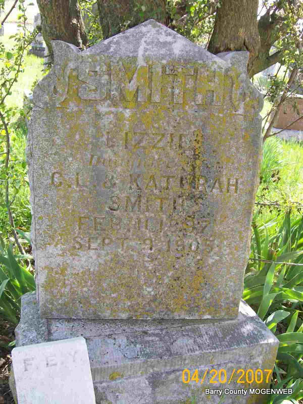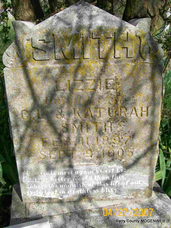 | SMITH, Lizzie | Feb. 11, 1897 | Sept. 9, 1905 | Inscription: "Dau. of C. L. and Katurah" - Research Note: Daughter of Calvin Lafayette Smith and Katurah Burrows. - Another Photo | Note Phyllis Long 1999 Transcription Photo Jay Trace |