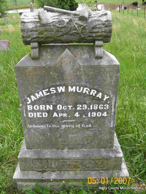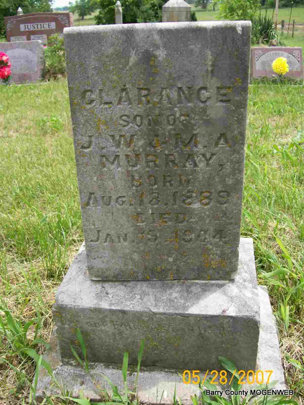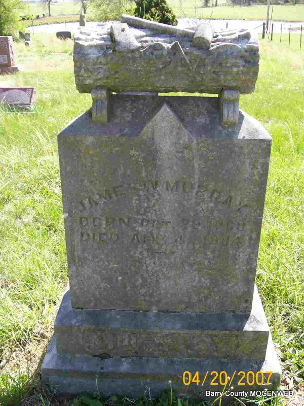Research Note: Maybe the son of Benjamin Franklin Murray and Marietta F. Wilson. Martha Alice Medlin married James W. Murray on Dec. 23, 1888 in Barry Co., MO. John S. Medlin, father of Martha, gave consent. - Another Photo | Census MO Marriage Records Phyllis Long 1999 Transcription Photo Jay Trace |