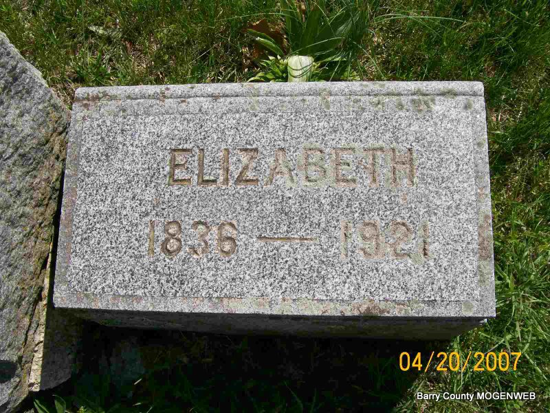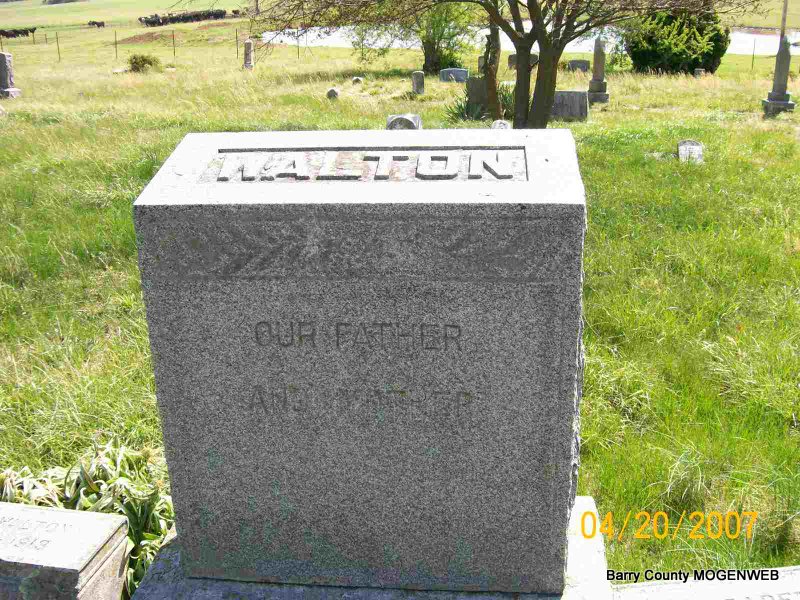 SSW: Elizabeth - Research Note: He was married and a farmer. Death Certificate says "Deceased was an orphan". Bert Walton of Monett, MO was the informant. - Cassville Republican, October 24, 1913, Thursday - Dead: Thomas Walton, who for 47 years had been residing in Barry County, died Wednesday morning of last week at his home south of Monett of Bright's Disease, age 78 years, 7 months and 18 days. The deceased was born in England and came to America and settled in this county in 1863. All this time he lived in the vicinity south of Monett in which he was recognized as one of he most substantial citizens. He was a member of the Mt. Pisgah M. E. Church in which his life bore the teachings of the principles. He is survived by a wife and three sons, Jack Walton of Springfield, Fred of Monett and Herbert who resides on the home farm. Funeral services, conducted by Rev. G. W. Qualls, were held Thursday and Interment made at the Mt. Pisgah Cemetery. - Plot Stone - Inscription: "Our Father and Mother" | Death Certificate Online Obit Phyllis Long Photos Jay Trace |