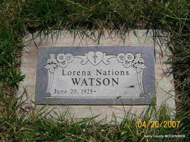 | WATSON, Lerena Faye (JACQUES) (NATIONS) | June 20, 1925 | No Date | Research Note: Daughter of William Alfred Jacques and Daisy D. Reno. Lerena's first husband was Horace "Hoss" Obern Nations. This is his partial obit: Horace "Hoss" Obern Nations, 90, of Denver, CO, formerly of Rogers, AR, died October 12, 2015. He was born in Snyder, TX on October 21, 1924, the second son to Sam and Roberta Nations. His family moved to the Cassville, MO area for his senior year of high school where he met Lorena "Jacquie" Jacques, his first wife and the surviving mother of his four children. Hoss and Lorena graduated from Purdy High School on April 30, 1942. He died in 2015 and is buried at Fayetteville National Cemetery, Fayetteville, AR. | Census Obit Phyllis Long Photo Jay Trace |