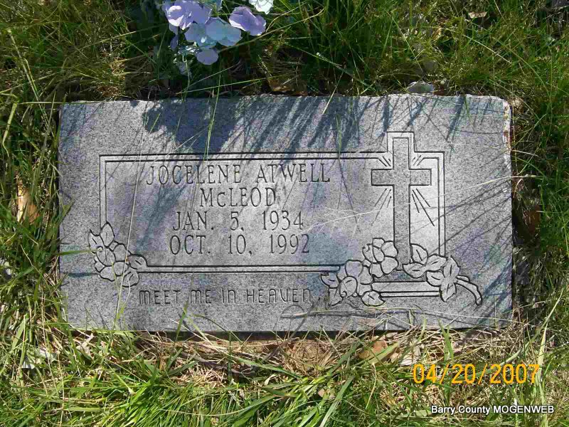 | MCLEOD, Jocelene Ruth (ATWELL) (ENGLAND) (MCLEOD) (LEMMINGS) (MCLEOD) | Jan. 5, 1934 | Oct. 10, 1992 | Inscription: "Meet Me In Heaven" - Research Note: Daughter of Hugh Austin Atwell and Vera Ruth Lowe. Jocelene Ruth England, age 31, married William Eddie England on Mar. 26, 1965 in Wheaton, Barry Co., MO. SS Death Index listing: July 1950: Name listed as JOCELENE RUTH ATWELL; June 1964: Name listed as JOCELENE RUTH ENGLAND; June 1972: Name listed as JOCELENE MCLEOD; Name listed as JOCELENE ATWELL LEMMINGS; 15 Oct., 15 1992: Name listed as JOCELENE R. MCLEOD | MO Marriage Records SS Death Index Phyllis Long 1999 Transcription Photo Jay Trace |