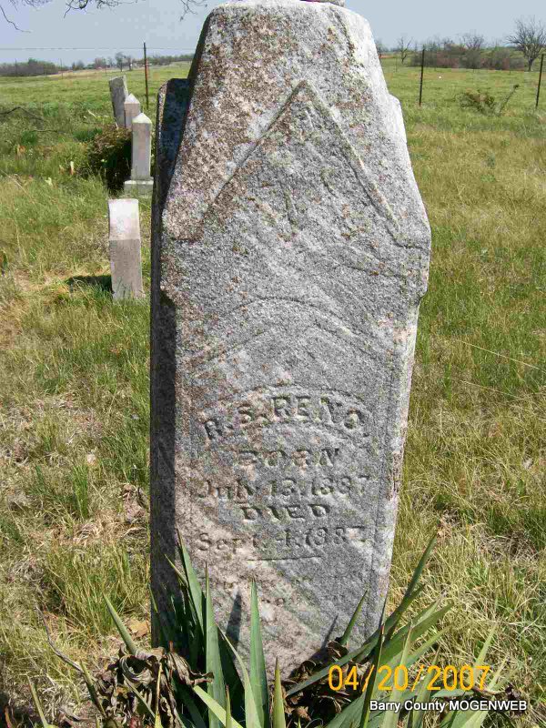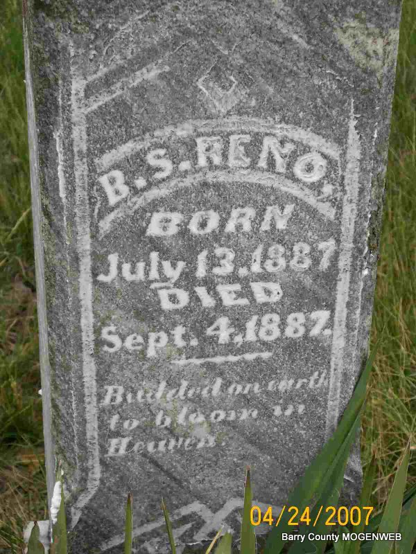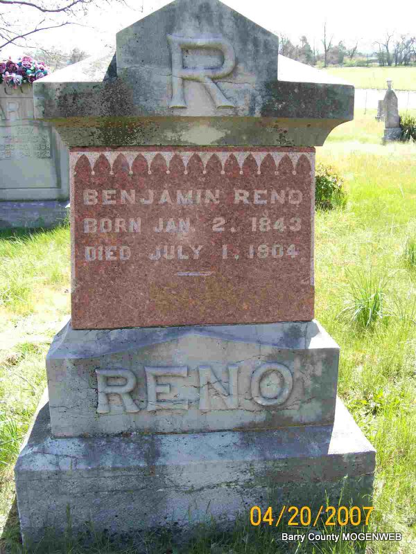 Research Note: Son of William Reno and Anna Shoaf. His wife was Mary Parks. - Cassville Democrat, July 9, 1904 Benjamin Reno of near Mineral Springs died very suddenly, July 1st of heart failure, age 61 years. He was born in Lawrence County, PA, Jan. 2, 1843 and came to Barry County in 1884 and settled on Stone's Prairie, where he resided until about two years ago, when he sold his farm there and moved to his late home. He and been in bad health for sometime and on the day of his death had gone to his barn and when found was sitting with one hand supporting his head. He left a wife and five children to mourn his death. He was a good citizen and had the respect and confidence of all his acquaintances. Besides he was a consistent member of the Protestant Methodist church. The remains were laid to rest in the Mt Pisgah Cemetery on King's Prairie, July 2nd. Barry County has lost a splendid citizen his family a loving husband and father. | Death Certificate Census Phyllis Long 1999 Transcription Online Obit Photo Jay Trace |