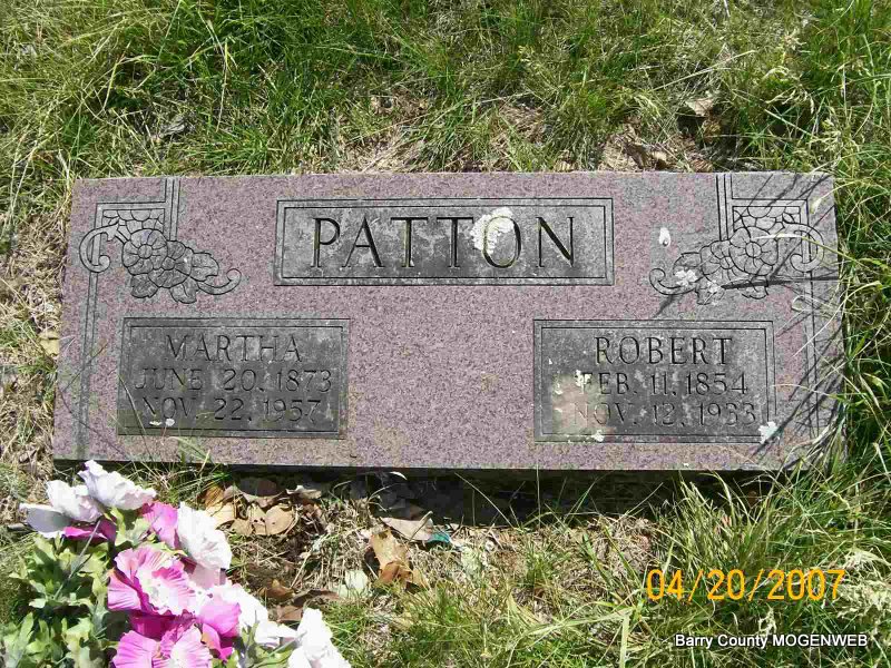 SSW: Martha - Research Note: He was a farmer and the son of Henry Patton born AR. Mother not named on the death certificate. Cecil Patton was the informant. Robert W. Patton, age 45, married Martha McDunner, age 27, on July 23, 1898 in Cassville, Barry Co., MO. - R. W. PATTON DIES - Funeral Services Wednesday at Mt. Pisgah Church. Robert Winfield Patton, 81, died at his home southeast of Monett at 11 o'clock Sunday morning, November 12. Funeral services will be held at 2:30 o'clock Wednesday afternoon at Mt. Pisgah church, conducted by Rev. Albion Erickson and Rev. O. M. Ennes. Burial will be made in the Mt. Pisgah cemetery under direction of the Hiram Bradford Funeral service of Marionville, assisted by H. I. Bradford. The body is at the home of his son, Cecil Patton of 212 Eighth Street. Mr. Patton was the youngest son of Mr. and Mrs. Henry Patton and was born at Fayetteville, Arkansas, February 11, 1852. He was first married to Elizabeth Goodnight. To this union was born three children, Elmer Patton of Phoenix, Arizona, Mrs. R. W. Points of Cement, Oklahoma and a child who died in infancy. After his first wife's death he was married to Martha McDunner, there being seven children born to them. They are Mae Moas, Mrs. Arthur Wadley, Cecil Patton, Winfred Patton and Herschel Patton, all of Monet, and Mrs. I. D. Simmons of Carl Junction. He is also survived by 22 grandchildren and one great grandchild. He was converted early in life and united with the Mt. Pisgah church. | Death Certificate MO Marriage Records Obit Phyllis Long 1999 Transcription Photo Jay Trace |